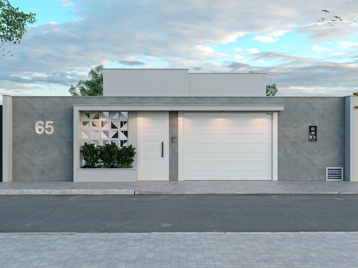 A Fachada E | Y foi pensada para transmitir leveza e modernidade, unindo linhas simples, texturas suaves e elementos atemporais. O cimento queimado em tom claro, combinado ao branco fosco das paredes e marquise, cria uma composição elegante e harmônica. O cobogó triangular traz ventilação, luz e um toque de identidade à fachada, enquanto o jardim frontal completa o conjunto com sutileza e frescor. Cada detalhe foi planejado para traduzir o estilo contemporâneo do casal e valorizar o imóvel de forma duradoura.